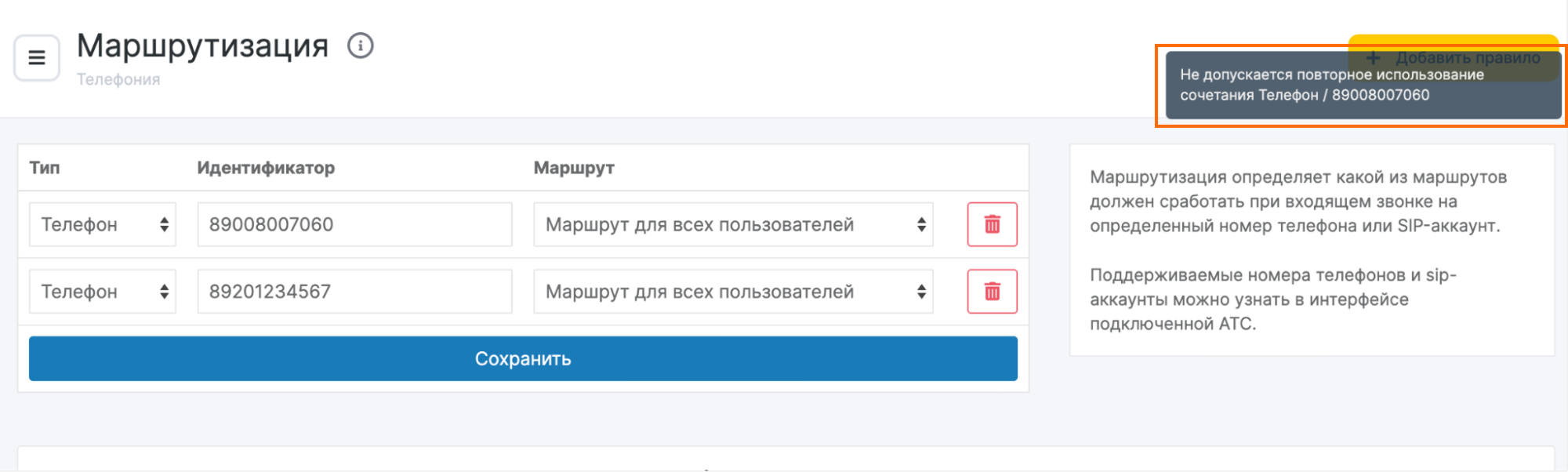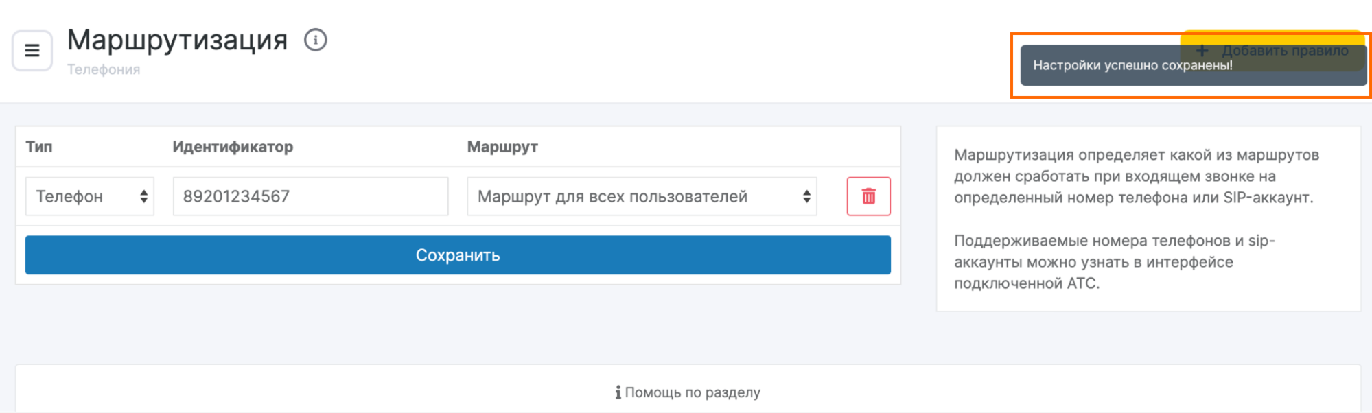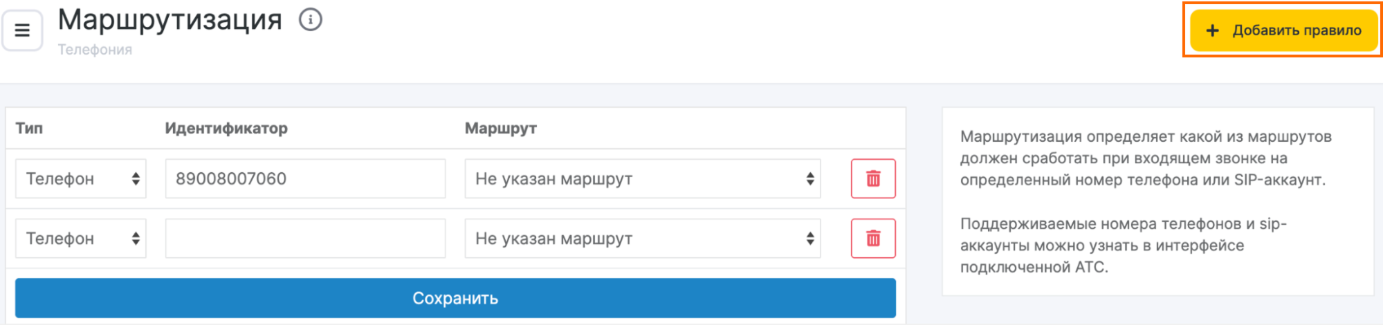 9. После настройки маршрута свяжите его с номером телефона/идентификатором абонента телефонии, SIP, на который поступают звонки. Для этого перейдите в раздел «Маршрутизация» –- «Добавить правило» .