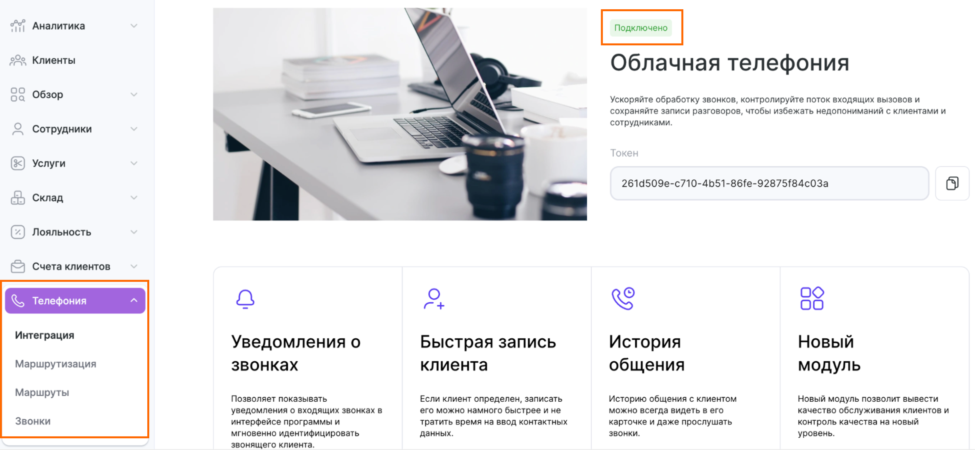 6. Перейдите в YClients. После завершения настроек в разделе «Телефония» появятся дополнительные разделы «Маршрутизация», «Маршруты» и «Звонки», а статус интеграции изменится на «Подключено».