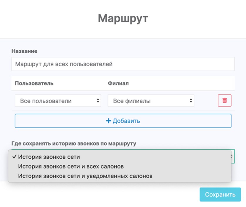 • История звонков сети и уведомленных салонов – всплывающее окно о звонке будет появляться в том филиале/филиалах, которые будут выбраны в этом маршруте.