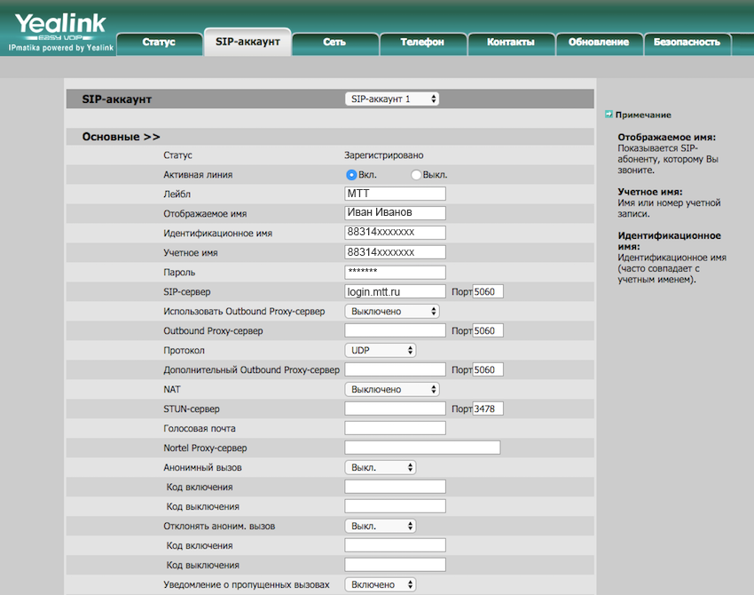6. В поля «Идентификационное имя» и «Имя пользователя» впишите логин (который начинается на 88314), укажите «Пароль» и SIP-сервер login.mtt.ru.